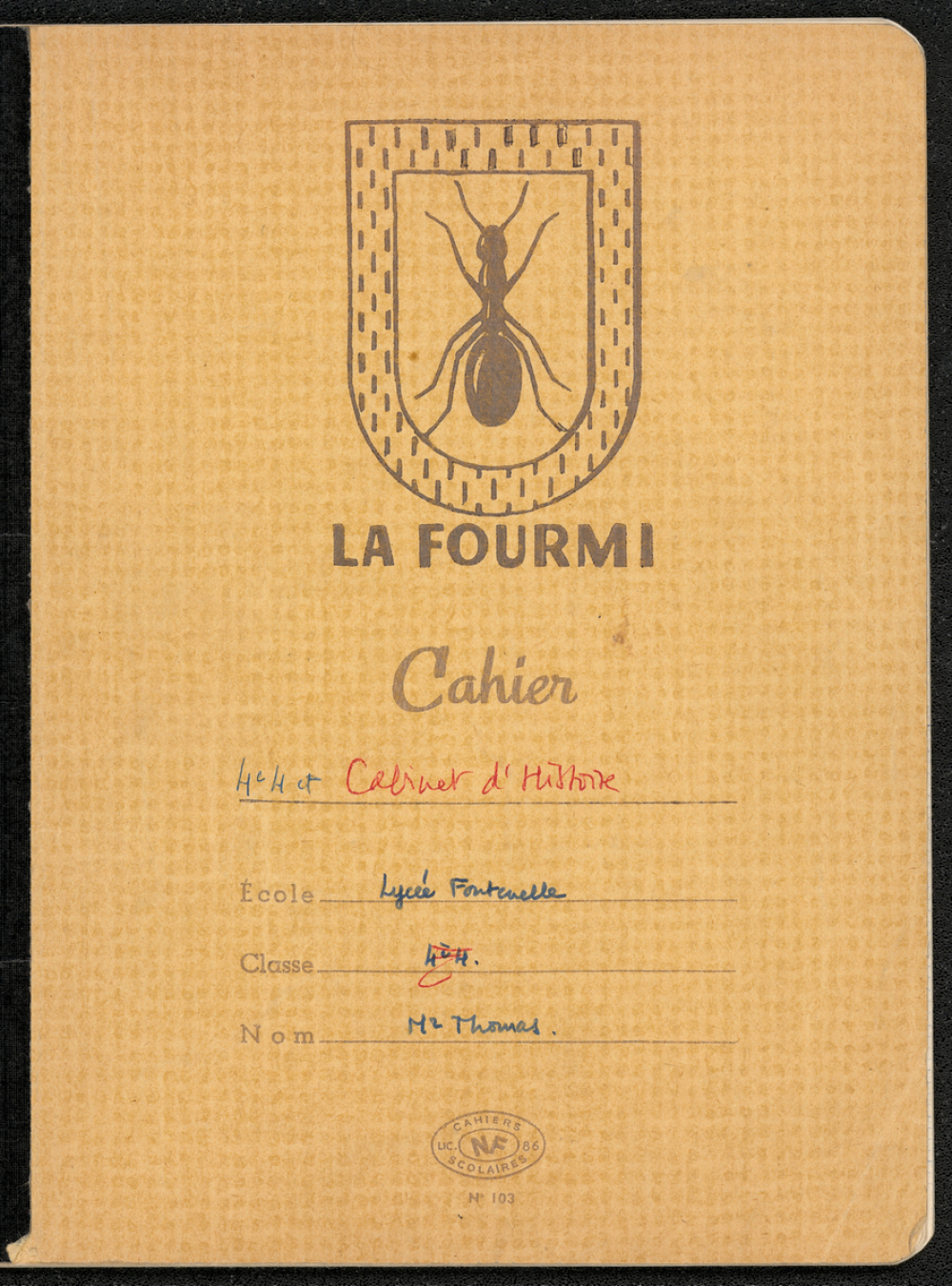 Éditeur : "La Fourmi", Cahiers scolaires NF LIC 86 N° 103 avec l'insigne de la marque représentant une fourmi dans un écu espagnol inséré lui-même dans un écu similaire composé de traits en pointillés.