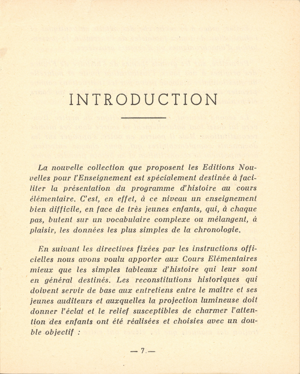 Historique : Les Éditions Nouvelles pour l'Enseignement (ENE), éditeur privé qui participe, dans les années 1950-1960, au développement des supports audiovisuels destinés à l'enseignement, propose une collection de 56 entretiens destinés à faciliter la présentation du programme d'histoire au cours élémentaire. L'ouvrage présente ici l'ensemble de ces entretiens, avec pour chacun des indications d'observation dirigée, des indications du récit, une conclusion et thème de résumé. En parallèle au livre, des films fixes ou diapositives sont proposés pour illustrer chaque entretien.