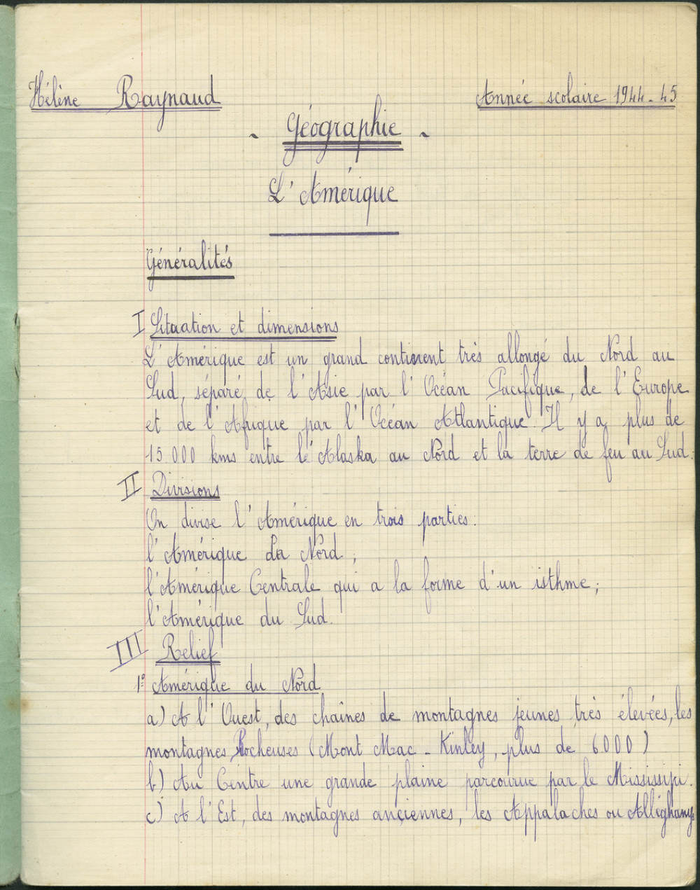 Leçons "L'Amérique" avec cartes "Amérique du nord (physique)" et "Amérique du Nord (politique)". "Etudes régionales - L'Amérique du Nord" : "Le Canada" (avec carte "Grandes régions du Canada"), "les Etats-Unis", "L'Amérique centrale (Mexique, Antilles, Canal de Panama et autres Etats)". "L'Amérique du sud" avec carte "Amérique du sud (politique)", "Le Brésil", "La République argentine", "Le Chili et les petits Etats d'Amérique du sud".