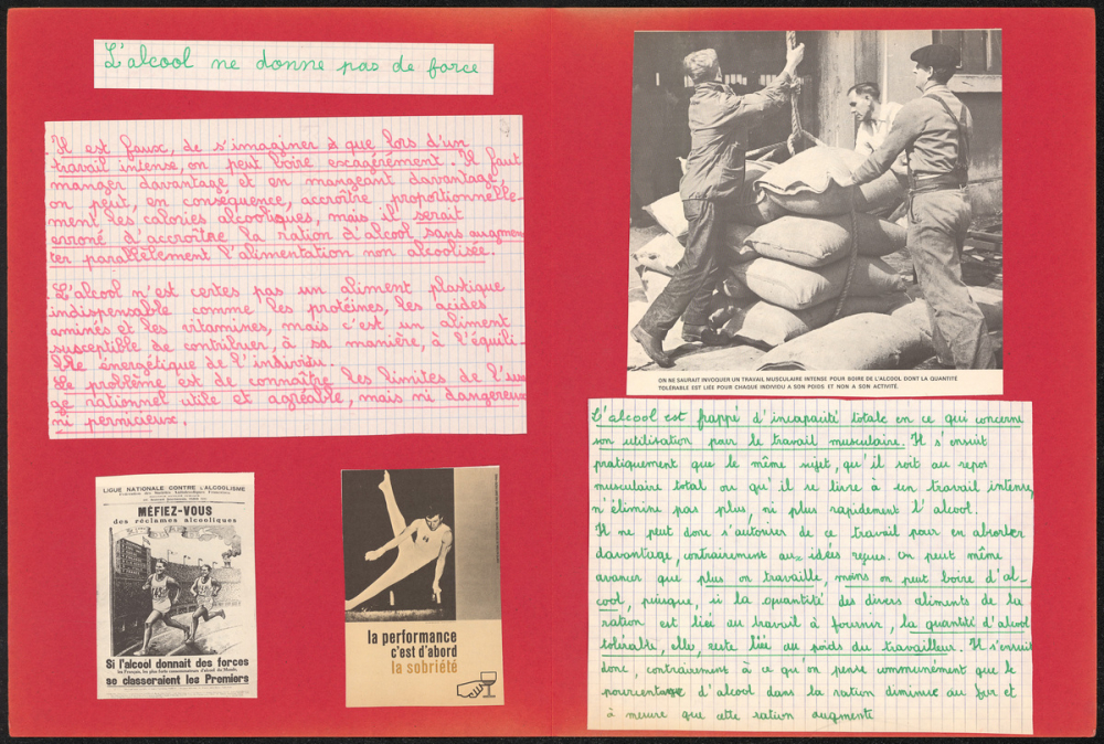 Description : Album composé de 13 chemises cartonnées rouges, textes écrits en feutres de plusieurs couleurs et illustrés par des graphiques, des articles, photos, reproductions, dessin d'élève.