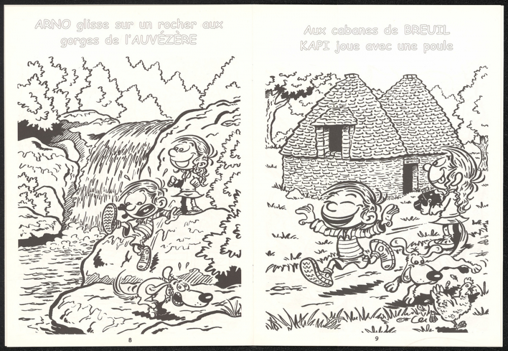 Représentations : scène : chien, oie, aigle, porc, bateau, château / Couverture en couleur montrant une petite fille prenant un petit garçon et un chien en photo devant un château. Feuillets intérieurs en noir et blanc présentant les deux enfants : dans la ville de Périgueux, dans le gouffre de Proumeyssac, au milieu des oies, sur le site troglodyte de la Roque Saint Christophe, au château de Milandes avec un fauconnier tenant un aigle, à la recherche de truffes, sur une gabare (bateau à fond plat), aux gorges de l'Auvézères, aux cabanes de Breuil, en visite dans la grotte de Lascaux, dans un champs de fraisiers et en voiture quittant la Dordogne.