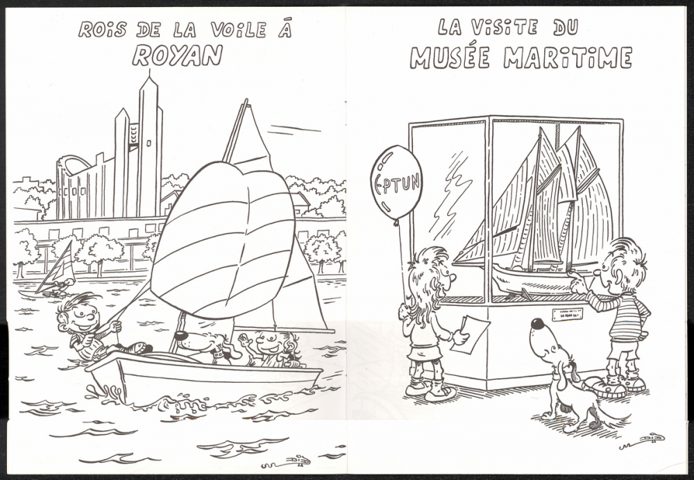 Représentations : scène : bateau, ours, chien, bateau à voiles, pieuvre, poisson, bicyclette, plage, âne, automobile / Couverture en couleur montrant une petite fille, un petit garçon pêchant et un chien dans un bateau. Feuillets intérieurs en noir et blanc présentant les deux enfants : observant un ours au zoo de la Palmyre, faisant du voilier, regardant une maquette de voilier au musée, sur le port au retour de pêche, visitant un aquarium, dans un bateau près de fort Boyard, en ballade à vélos, en ballade à dos d'âne, sur la plage en train de bronzer et de construire un château de sable, pêchant à marée basse, sur une barque dans le marais poitevin, dans une voiture quittant la Charente-Maritime.
