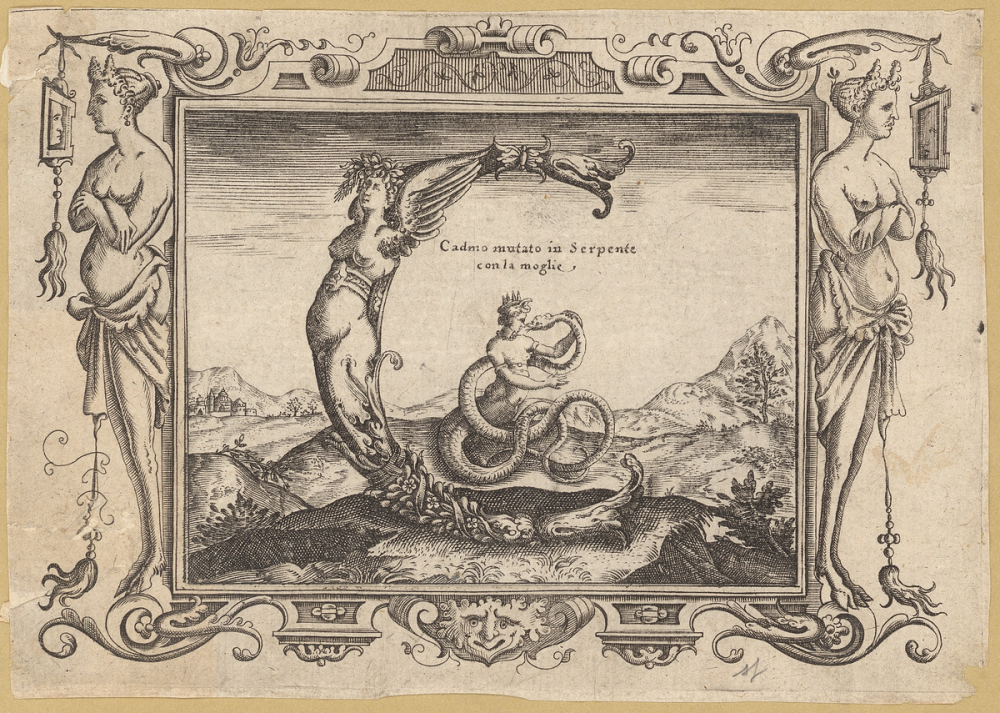 Alphabet anthropomorphe de Paulini. Cadmo mutato in Serpente con la moglie.