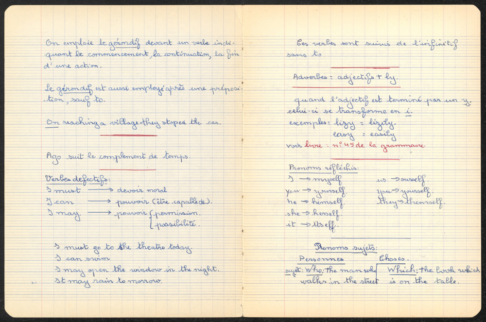 Notes : Il s'agit d'un cahier d'exercices d'anglais de Martine Leroy-Bouveyron (née Leroy) alors âgée de 13 ans, élève de 4e M2 au Lycée Victor Duruy à Paris (VIIe arrondissement), durant l'année 1960-1961.