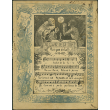Représentations : scène : lune, Pierrot, chandelle, Arlequin / Illustration de la chanson Au clair de la lune