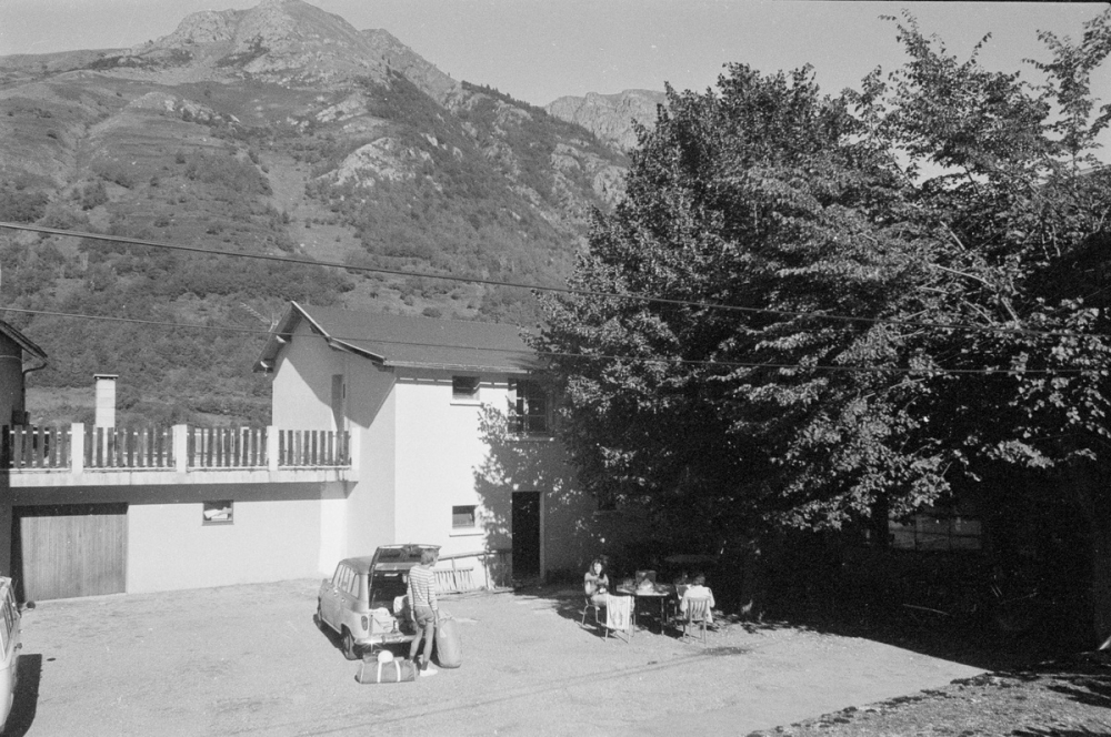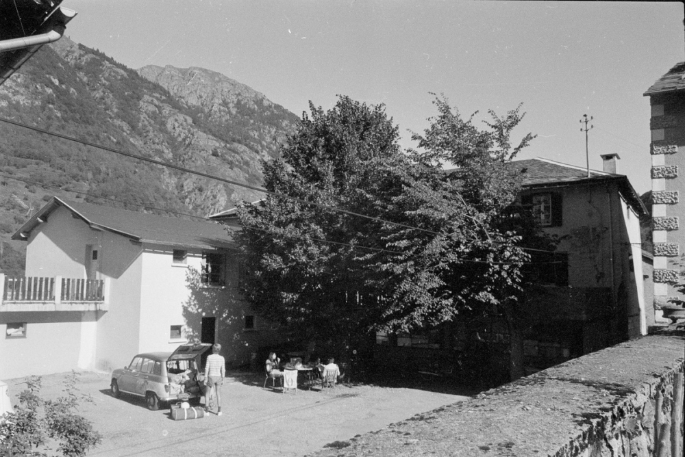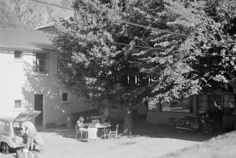 Représentations : vue d'architecture : auberge / Cinq vues montrent la cour de l'auberge, avec une voiture auprès de laquelle se tient une personne au niveau du coffre, tandis qu'une autre est assise sur une chaise. À l'arrière-plan, on aperçoit la montagne.