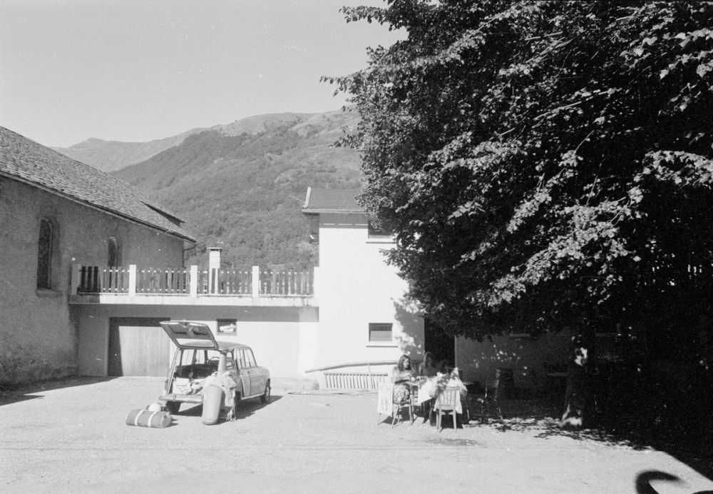 Représentations : scènes : auberge / Trois vues montrent la cour de l'auberge, où des personnes sont assises. On y aperçoit également une voiture au coffre ouvert et un chien.