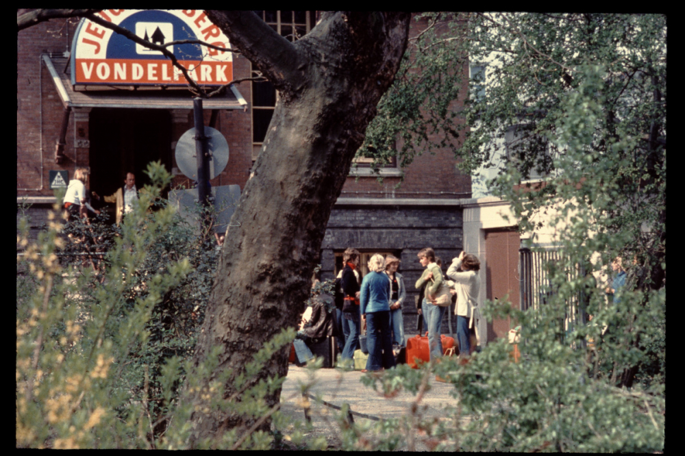 Représentations : scènes : auberge / Des personnes se tiennent devant l'entrée de l'auberge de jeunesse. Des sacs sont posés au sol. De la végétation et un tronc d'arbre apparaissent au premier plan. Au-dessus de la porte d'entrée figurent le logo des auberges de jeunesse et l'inscription « Vondelpark » sur fond rouge.