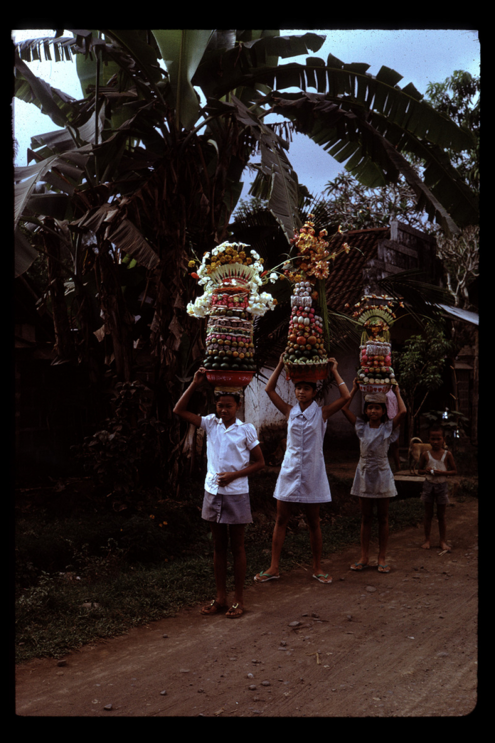 Représentations : scènes : fille / Trois jeunes filles portent sur leur tête des récipients contenant des aliments et des fleurs