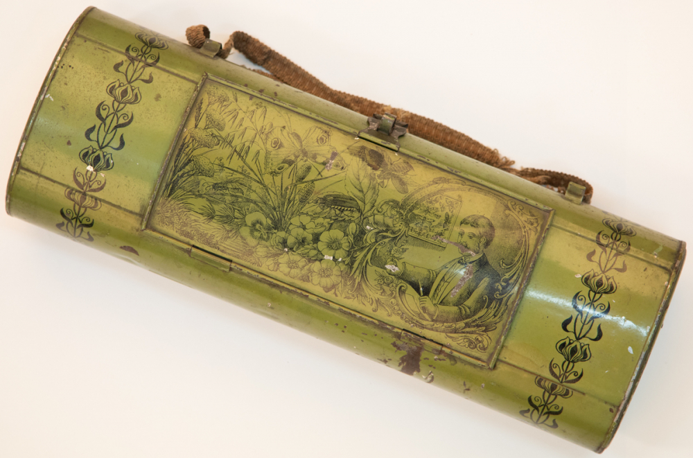 Description : Boite à herboriser en métal chromolithographiée. Décor: Fleurs, papillons, insecte, personnage. Une lanière en corde fait office de poignée.
