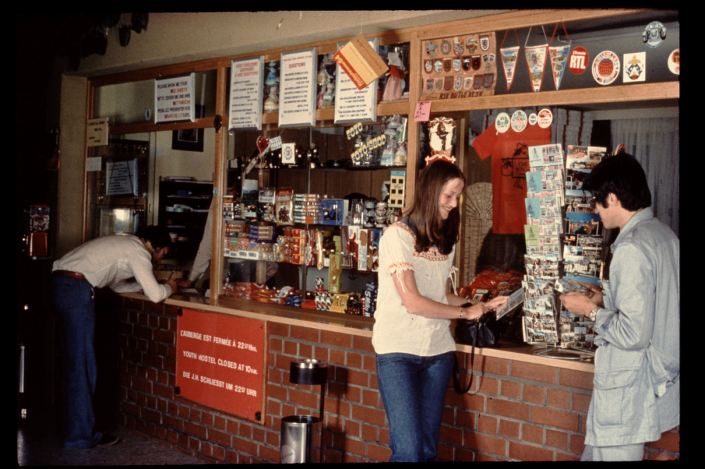 Représentations : scènes : auberge / Le visuel montre la boutique de souvenirs de l'auberge. Une jeune fille et un jeune homme regardent des cartes postales, tandis qu'un autre homme se tient au comptoir. Un panneau rouge indique les heures de fermeture de l'auberge, inscrites en français, en anglais et en allemand.
