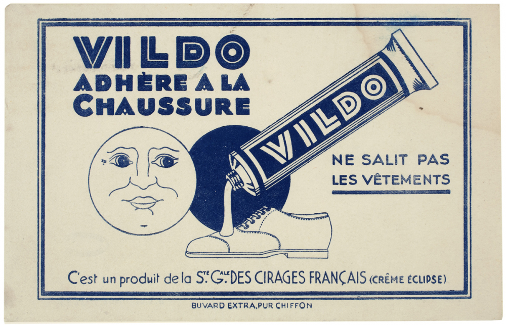 - Texte : "Vildo adhère à la chaussure. Ne salit pas les vêtements. C'est un produit de la Sté Générale des cirages français (société Eclipse)."