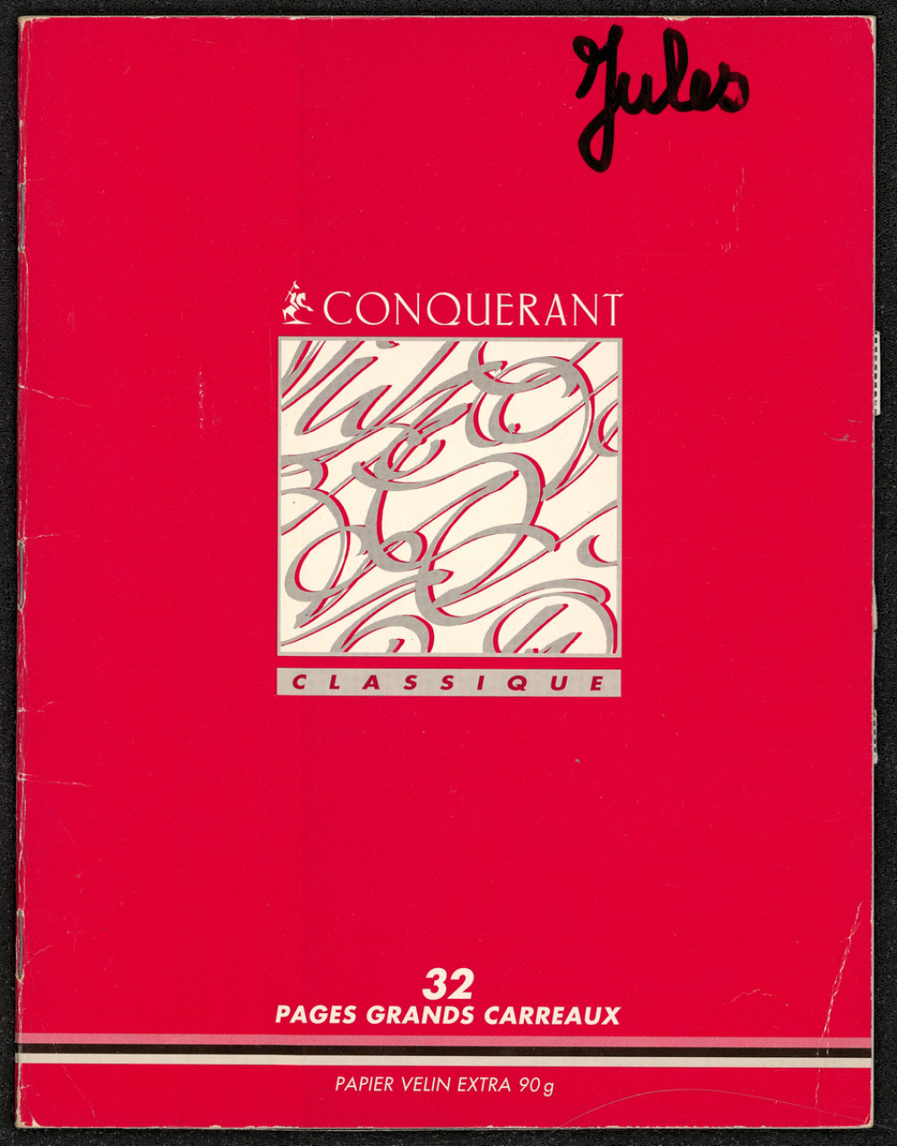 Description : Couverture en papier cartonné glacé rouge. Reliure agrafée. Réglure Séyès carreaux 10 x 10 mm interlignes 2,5 mm avec marge rose.