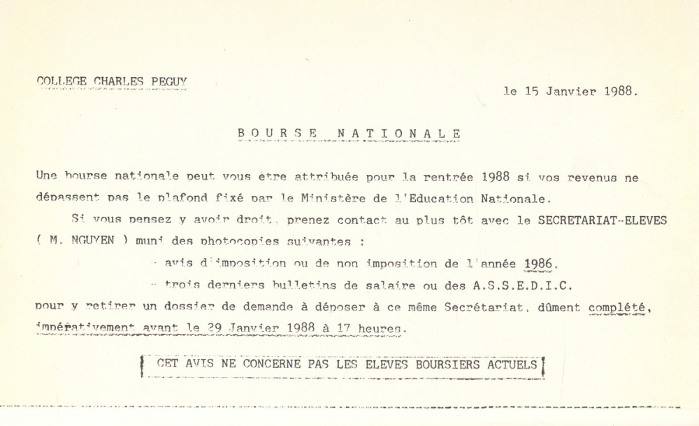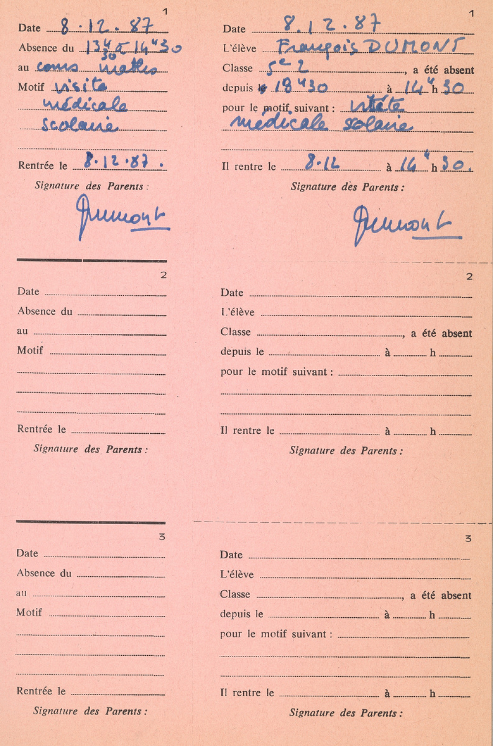 Description : Cahier de correspondance de l'élève Dumont François du collège Charles Péguy, Paris 19e.