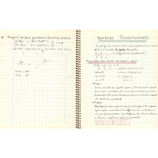 Description : Cahier à spirales, couverture cartonnée orange, 1ère de couverture avec en bas, imprimé en noir "Vélin d'Angoulême". Réglure seyes, encre noire, rouge, bleue, verte, feutre noir. 2 feuilles simples, l'une à petits carreaux, l'autre à réglure seyes, pliées en deux, insérées dans le cahier.