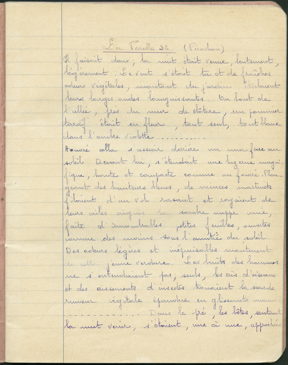 Description : Cahier cousu. Couv. papier rigide de couleur rose, renforcée en son dos par un liseret textile de couleur noire. En Première p. de manuscrit : les mentions "Cours complémentaire de Jeunes Filles - Chef Boutonne" ainsi qu'une sorte de motif composé de formes végétales et géométriques. Réglure : réglure ligne simple. Ecriture à l'encre bleue et noire, et au crayon à papier. Il est écrit en Première p. de couv., au crayon à papier (nom de l'élève, matière et année).