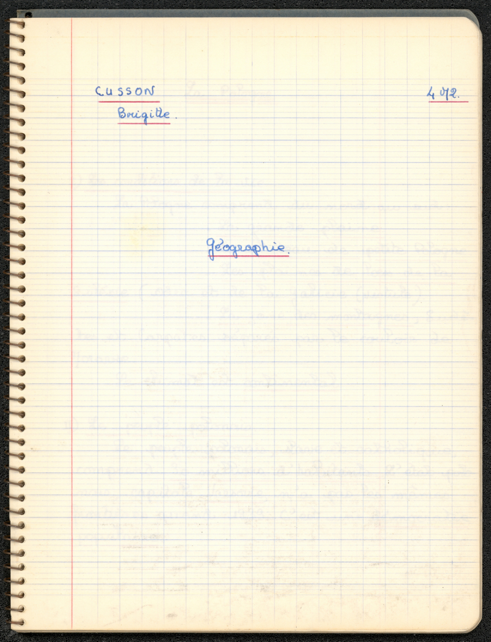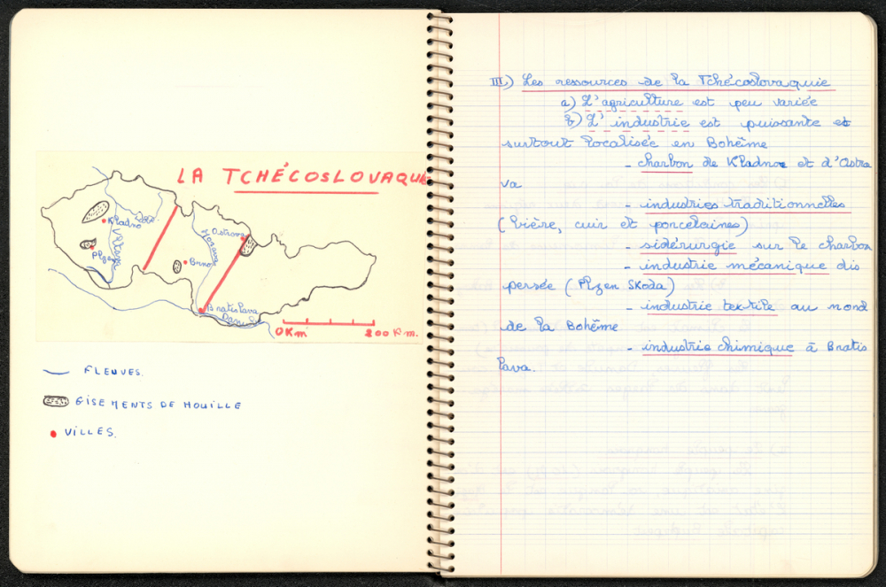 Notes : Il s'agit du cahier de Géographie de Brigitte Cusson, élève de 4e M2 du Lycée Jeanne d'Arc de Rouen, dont l'enseignant était Dominique Thomas durant l'année 1964 -1965.