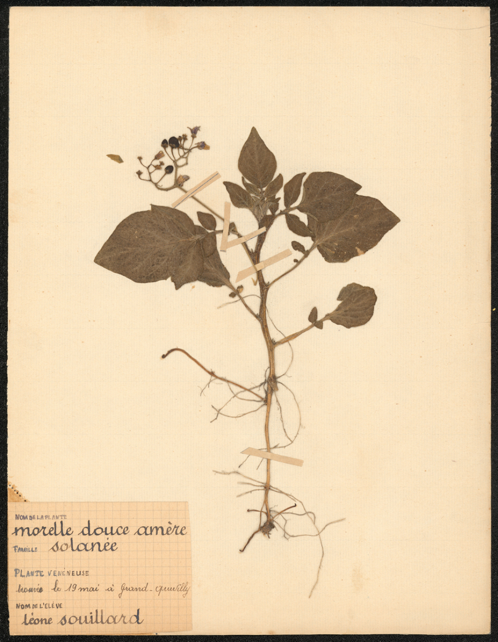 Pour chaque feuille (sauf les deux dessins), présence d'une étiquette manuscrite, sur papier à réglure à petits carreaux, comportant le nom de la plante, le lieu, la date de récolte et le nom de l'élève qui l'a cueillie.
