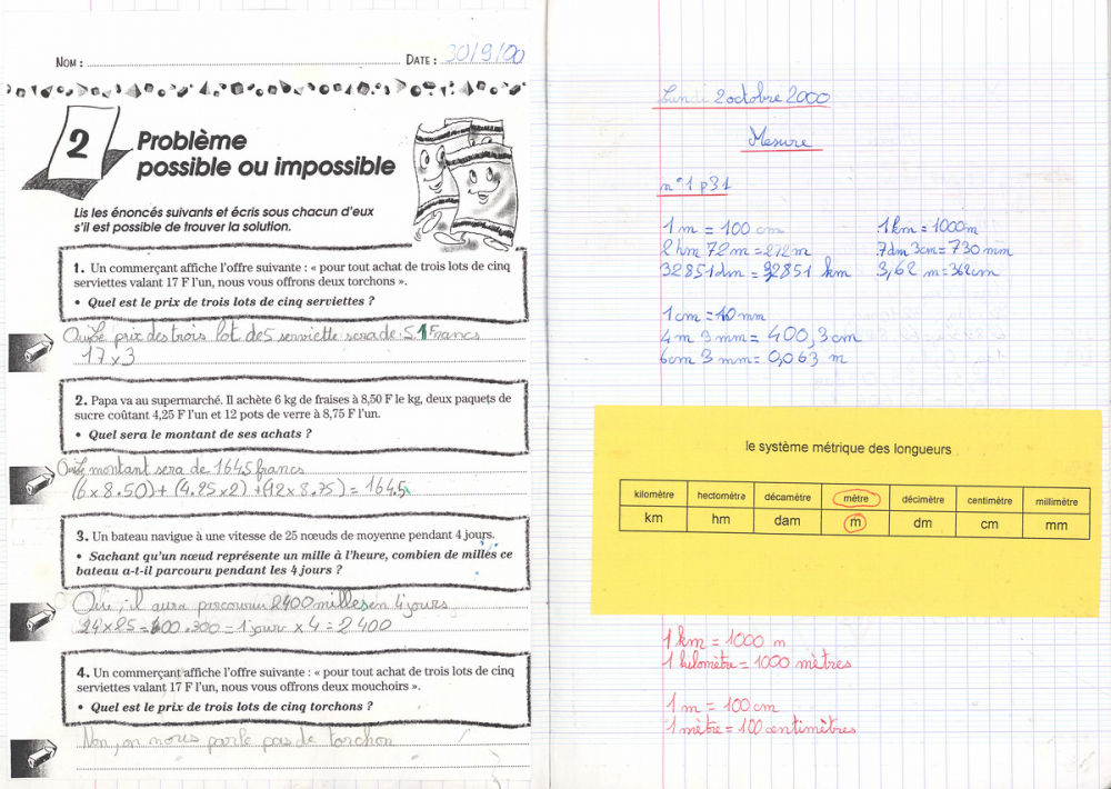 Notes : Cahier de mathématiques composé de divisions, de problèmes, d'écritures de nombres, d'exercices de supériorité et d'infériorité, de géométrie, de soustractions, d'additions, de mesures, des différentes droites, de multiplications, de divisions, les nombres décimaux, de fractions.