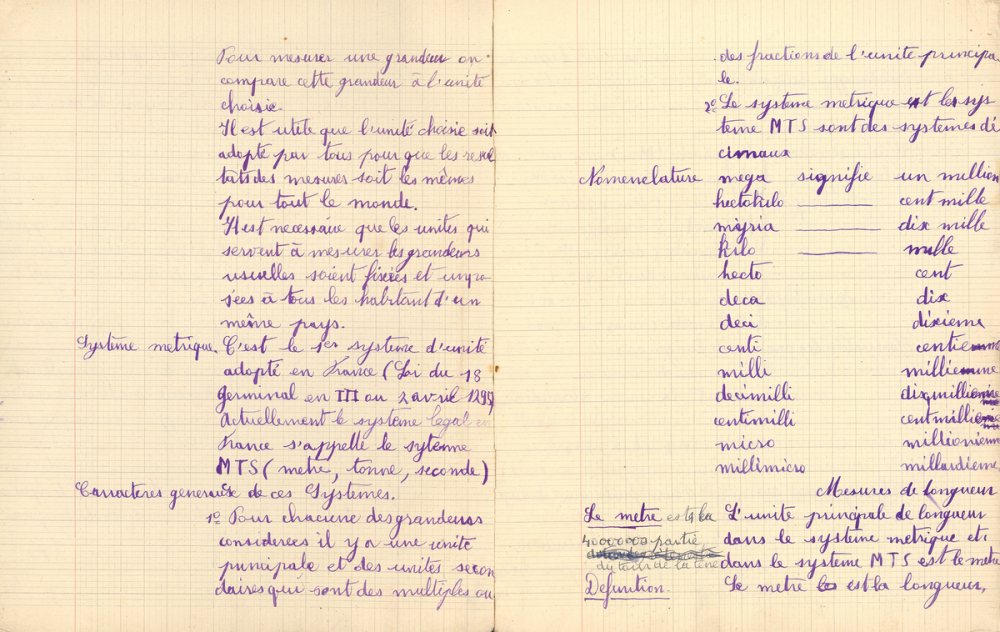 Notes : Cahier de leçons de mathématiques (cours complémentaire?): système métrique (longueurs, surfaces, mesures agraires, volume, masses, densités, monnaies, temps), numération décimale, volumes des solides, nombres complexes, les égalités.