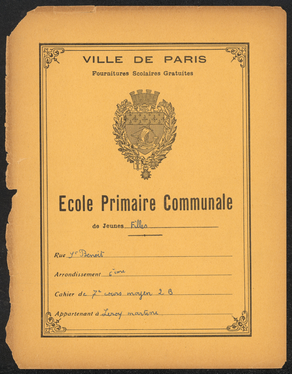 Notes : Cahier de rédaction de Martine Leroy-Bouveyron (née Leroy) alors âgée de 10 ans, élève de CM2, à l'école communale de la rue Saint Benoît à Paris (VIIe arrondissement), durant l'année 1957 à 1958.