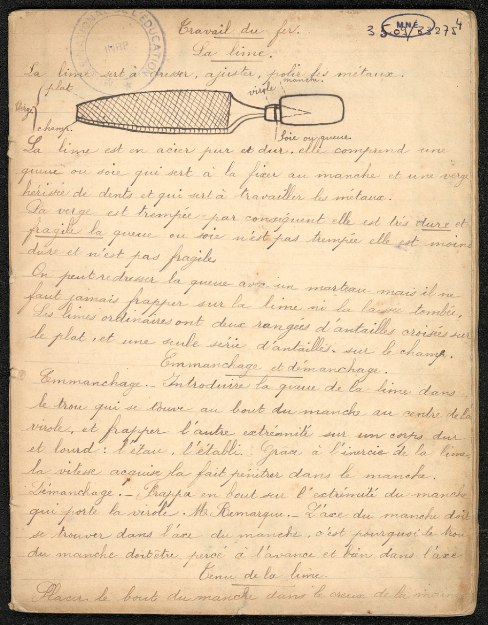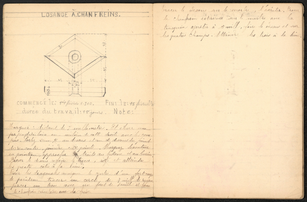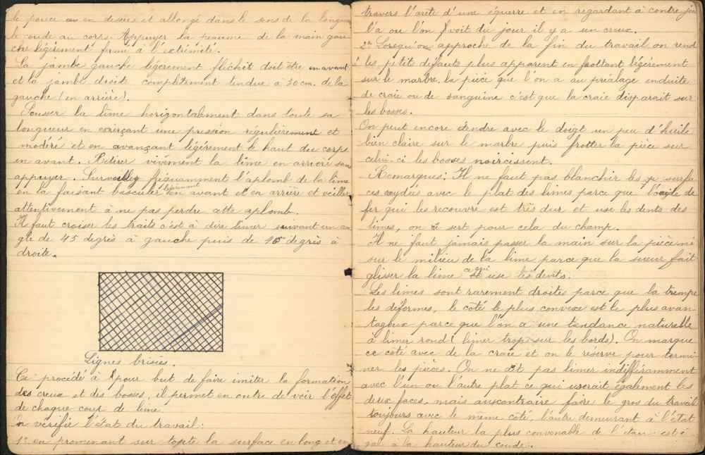 Notes : Travaux pratiques : travail du métal et du bois ; réalisation de pièces schématisées sur le cahier, mention du temps de réalisation et de la note obtenue