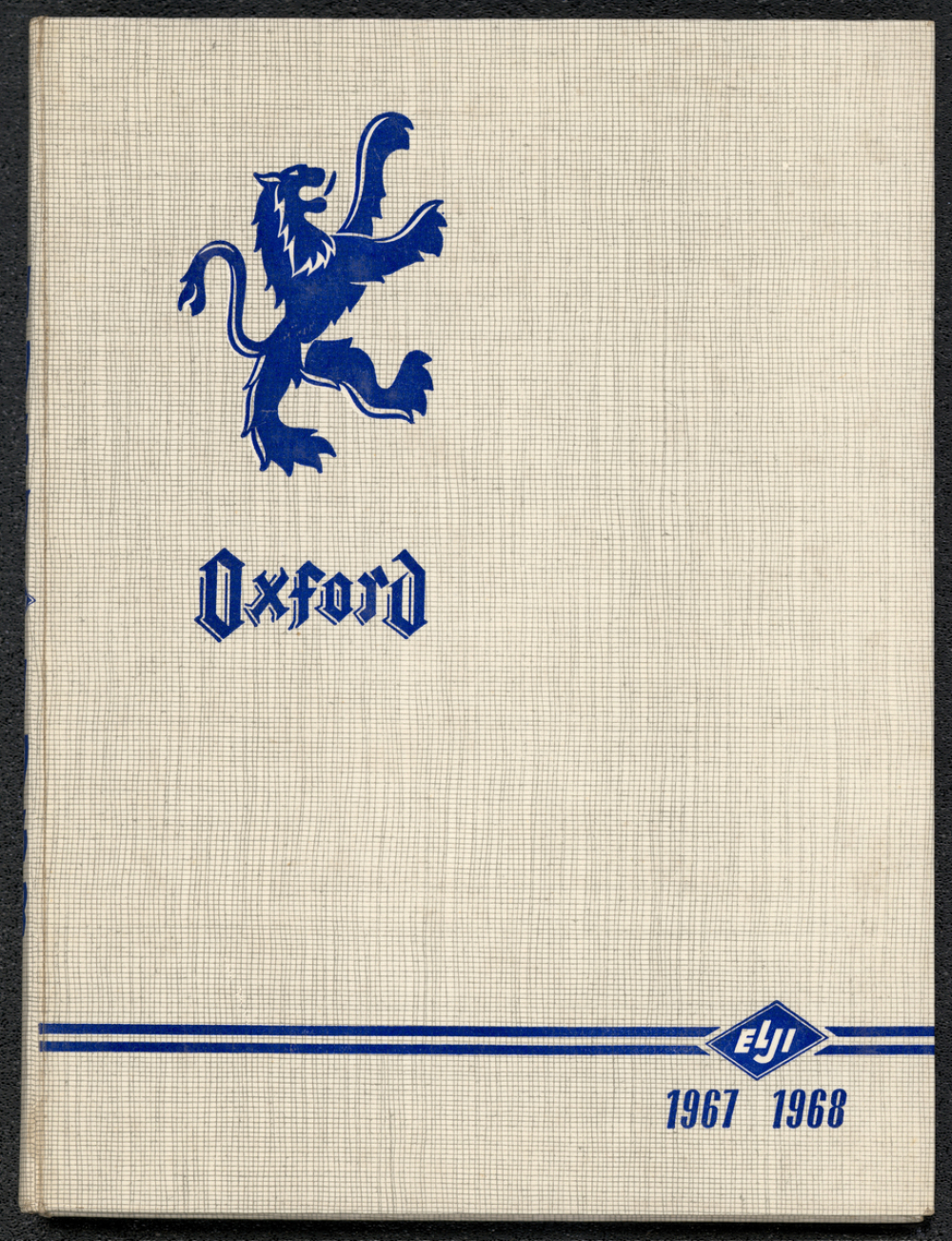 Éditeur : Oxford, Elji 1967-1968. Insigne de la marque représentant un lion bleu rampant de profil, levé sur la patte arrière droite avec les pattes avant droite et gauche avancées en position d'attaque, la queue relevée verticalement dont l'extrémité forme une vague.