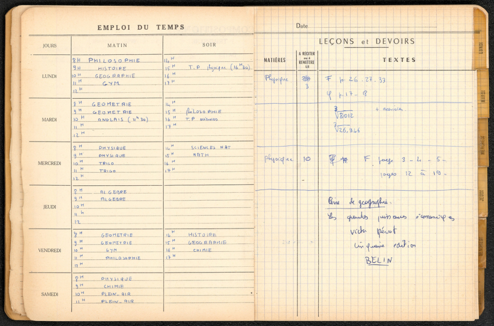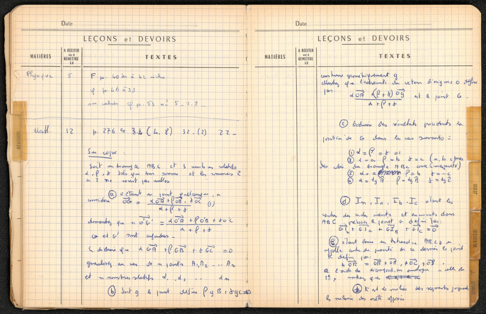 Notes : Il s'agit du cahier de textes de Marie-France Rocquemont (épouse Morel), élève alors scolarisée au lycée Marie Curie de Sceaux (Hauts de Seine, ex-Seine) en classe de Terminale série Mathématiques élémentaires, durant l'année 1958-1959.