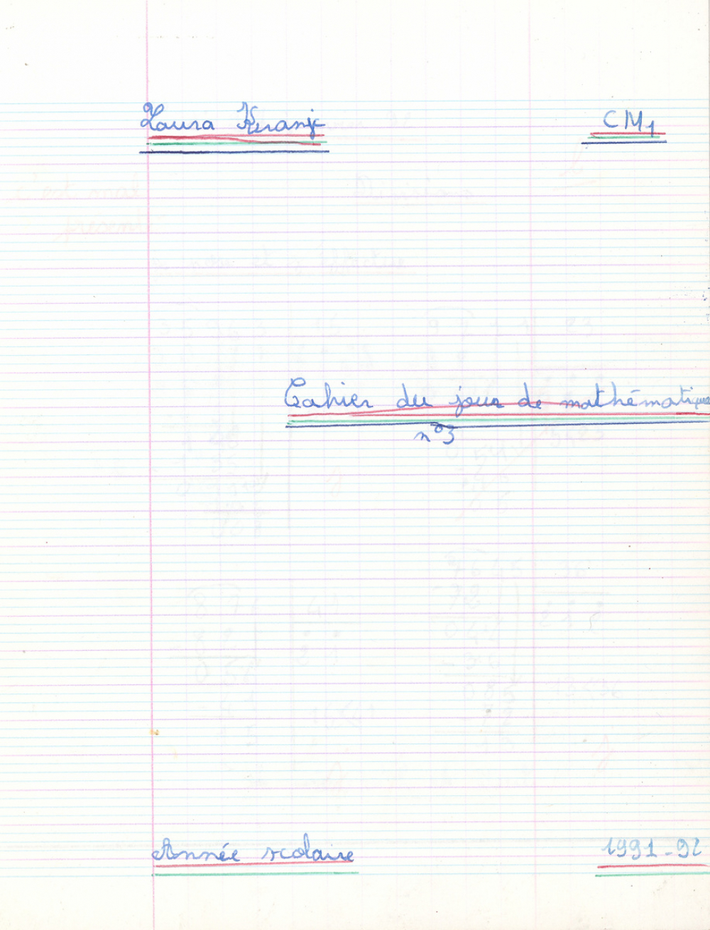 Description : Cahier agrafé, couverture rouge,1ère de couverture avec en haut "ville de Marseille" encadrant le blason de la ville, dessous "année scolaire 19-19-", puis "cahier" complété par le titre, "Elève" complété par le nom, "Classe" complété par CM1 à l'encre bleue, Ecole" par "Saint-Gabriel", en bas "fournitures scolaires gratuites". Réglure seyes, encre bleue, rouge, verte, noire, crayon de bois, feutre marron. 47ronéotypes et 2 copies simples réglure seyes, perforée, l'une insérée en début de cahier, l'autre agrafé à la fin, 3 bandes de papier collées.