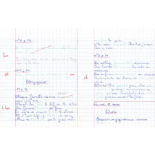 Réglure seyes, avec marge, encre bleue, stylo rouge, vert, crayon de bois et de couleur bleue.