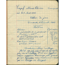 Notes : Lignes d'écriture. Dictées ("Un humble logis" de Th. Gautier, "Le travail", "L'arbre de Noël", "Le pain d'autrefois", "Le zingueur sur le toit", "La neige" de J. Renard, "La tourmente dans la montagne", "Le vieux paysan", "Mon grand-père", "Un malade énervé" d'E. Guillaumin, "La mort de l'alpiniste", "Le seau d'eau"). Questions sur le texte. Grammaire, Conjugaisons. Paragraphe en commun ("Vous écrirez à un frère ou à une sœur pour lui raconter ce que vous faites à l'école"). Rédactions ("Vous invitez une compagne à passer quelques jours de vacances chez vos parents. Vous lu décrivez votre village" ; "La matinée du Nouvel an. Dîtes comment vous l'avez passée" ; "Un maquignon veut acheter une vache. Ses gestes. La discussion entre le vendeur et l'acheteur. reproduisez le dialogue" ; "Un matin d'hiver, vous entrez en classe Le poêle fonctionne mal. La salle reste froide et enfumée. Conséquences. Initiatives du maître et des élèves en vue d'améliorer la combustion. Le poêle ronfle enfin" ; "C'est une période de pluie. Une auto passe en trombe dans la rue boueuse et éclabousse les piétons. Cris, exclamation, indignation de chacun... Racontez la scène" ; "Dans la rue ou à la campagne, un coup de vent enlève votre chapeau ou votre béret. Le voilà qui roule, file. Vous courez pour le rattraper"). Démographie (avec schémas, faits au crayon à papier et aux crayons de couleurs). Calculs. Problèmes, Calculs, Opérations. Géométrie (avec figures, faites à l'encre, au crayon à papier et aux crayons de couleurs). Morale (''L'amour maternel", "La gourmandise", "L'alcool est le plus grand fléau de notre siècle" x2, "Faites vous un corps vigoureux", "Soyons sobres, exerçons nos muscles, nous n'aurons pas besoin de remède pour nous bien porter"). Instruction civique ("L'Assemblée nationale", "Initiative des lois, Rôle de l'Assemblée nationale", "Rôle du Parlement").