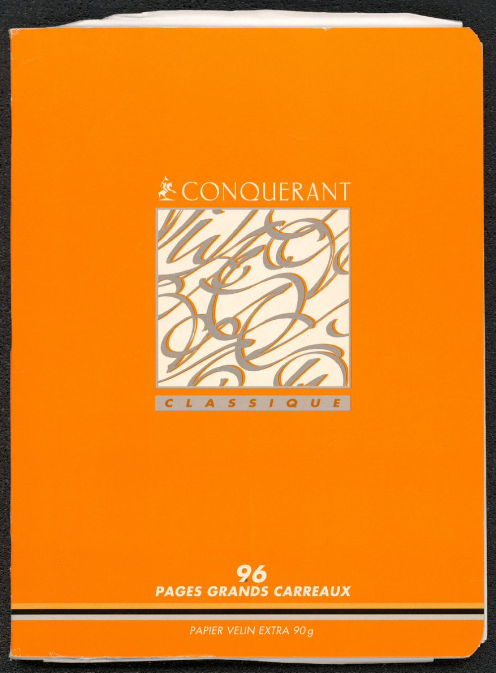 Description : Cahier en papier vélin, à la couverture en papier cartonné et plastifiée et à la reliure piquée agrafée. Réglure Séyès.