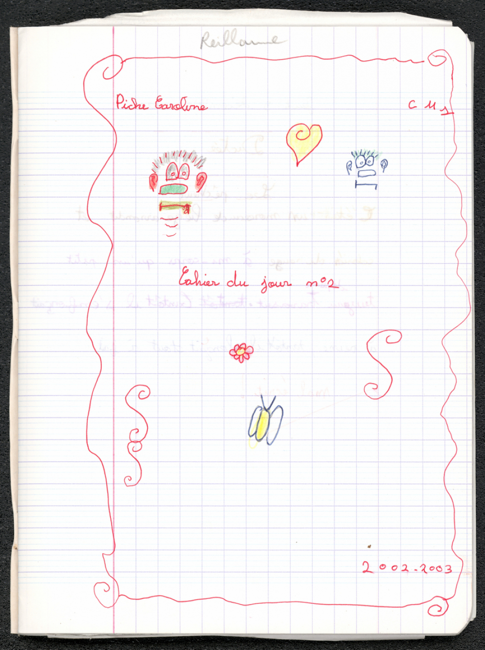 Notes : Cahier du jour n°2 appartenant à Caroline Piche, scolarisée en classe de CM1 à l'école de Reillanne (04) pour l'année scolaire 2002-2003.