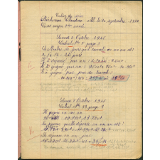 Description : Cahier agrafé. Couv. de couleur rose illustrée, en Première de couv., de motifs floraux stylisés et portant les mentions "Ecole de ... - Cahier de ... Appartenant à ...". En Quatrième de couv. : "Table de multiplication - Division du temps - Signes abréviatifs emplyés en arithmétique - Chiffres romains". Réglure Seyès. Ecriture à l'encre violette, corrections au crayon à papier. Notes et remarques de l'enseignant à l'encre rouge. Quelques figures géométriques faites au crayon à papier et aux crayons de couleurs.