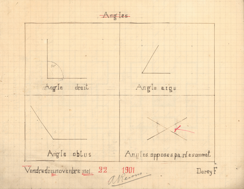Deux travaux de géométrie : les différents angles, et un tracé de perpendiculaires.