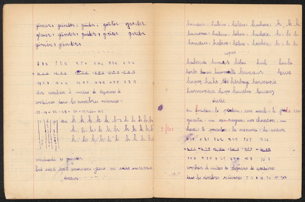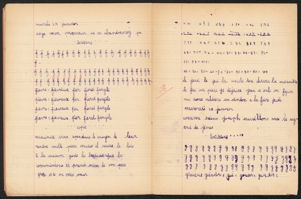 Notes : Il s'agit du cahier journalier de Marie-France Rocquemont (épouse Morel), élève alors scolarisée à l'école Notre-Dame du Sacré-Coeur de Ploemeur (Morbihan) en classe de cours préparatoire 2e année, durant l'année 1947-1948.