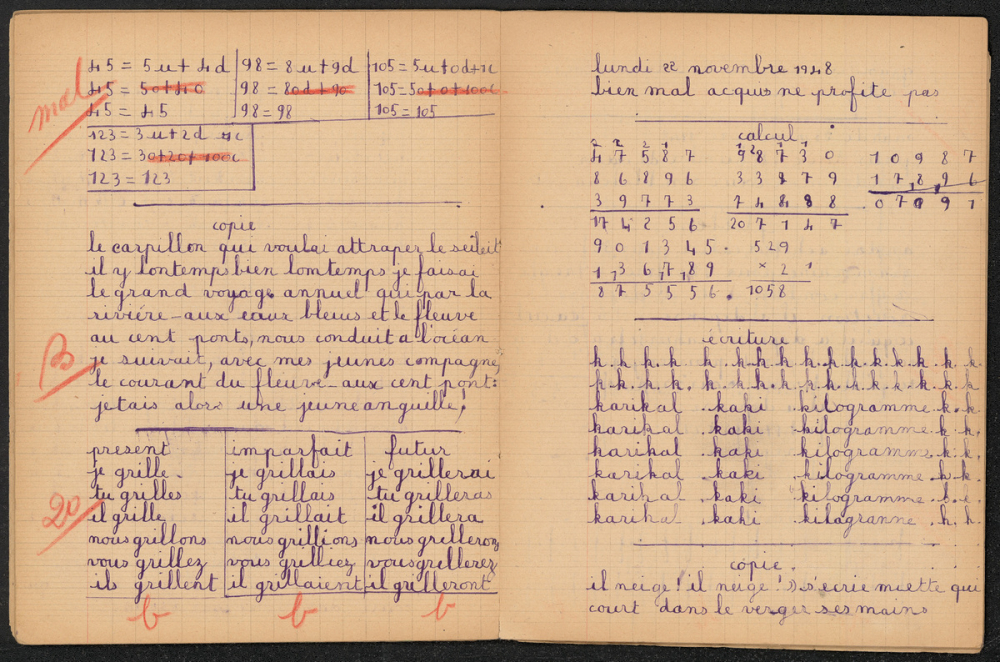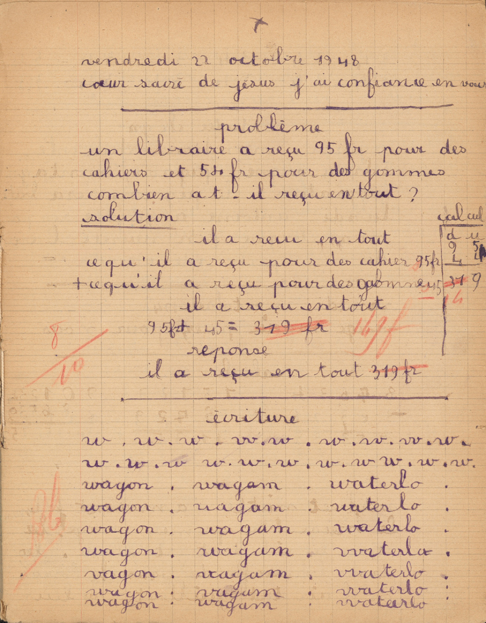 Notes : Il s'agit du cahier journalier de Marie-France Rocquemont (épouse Morel), élève alors scolarisée à l'école Notre-Dame du Sacré-Coeur de Ploemeur (Morbihan) en classe de 10e, durant l'année 1948-1949.