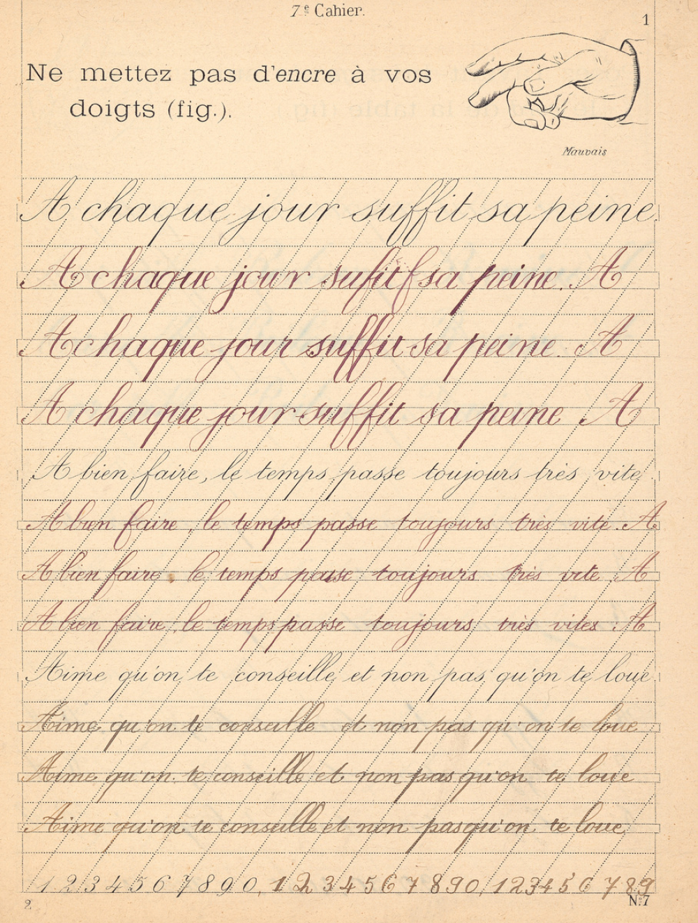 Notes : Cahier n°7, appartenant à une série de 11 cahiers pour l'apprentissage de l'écriture selon la Méthode Marchand; apprentissage de la cursive (cahiers n° 1 à 9), de la ronde (n°10), de la bâtarde (n°11). Chaque page présente en haut un conseil illustré parfois d'un dessin, modèles d'écritures de différentes hauteurs (lettres, syllabes, mots, chiffres).