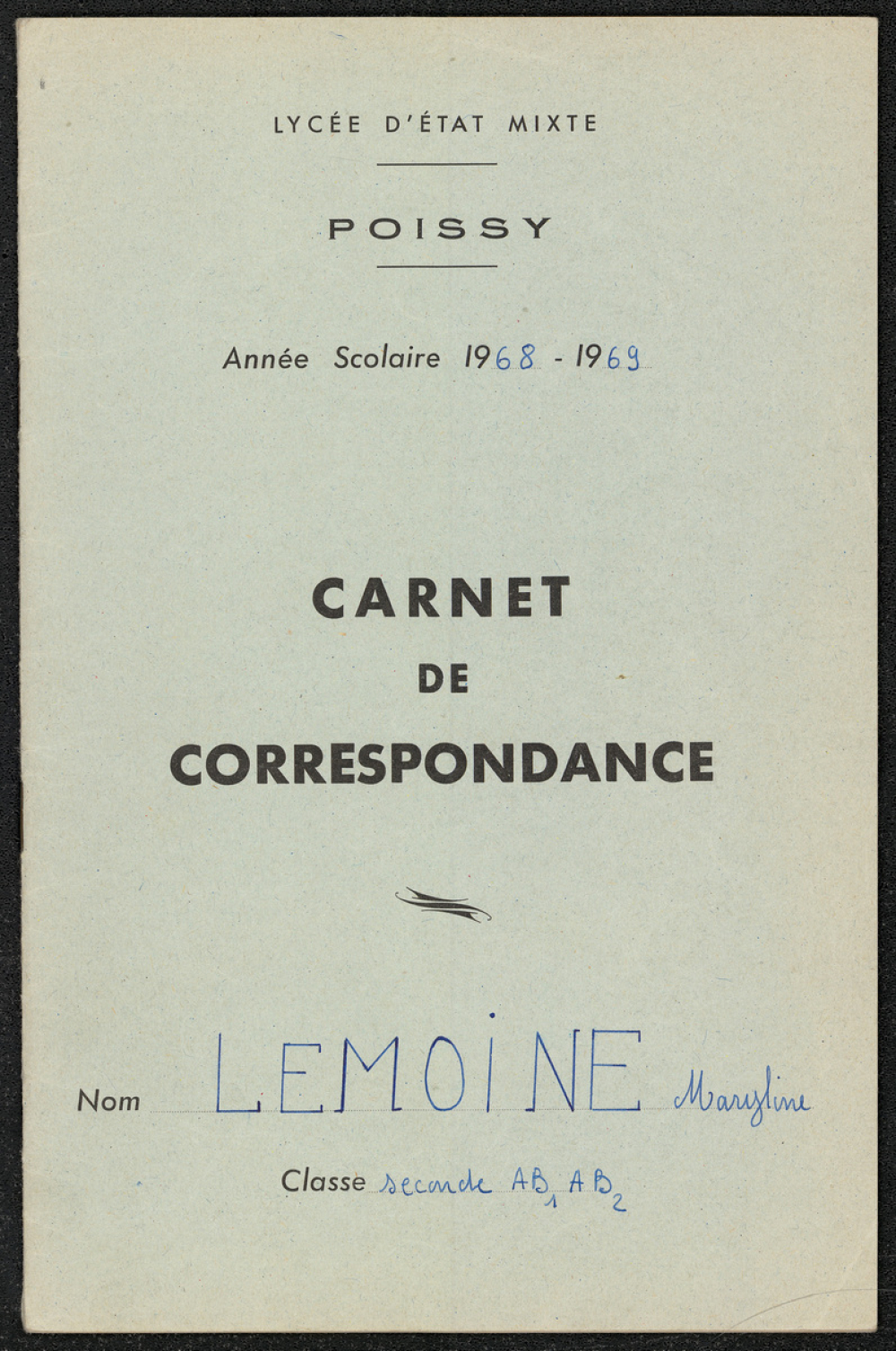 Notes : Il s'agit du carnet de correspondance de l'élève Maryline Lemoine, scolarisée en classe de seconde AB1 AB2 du Lycée Mixte de Poissy (nommé Le Corbusier, cf. Note), durant l'année scolaire 1968-1969.