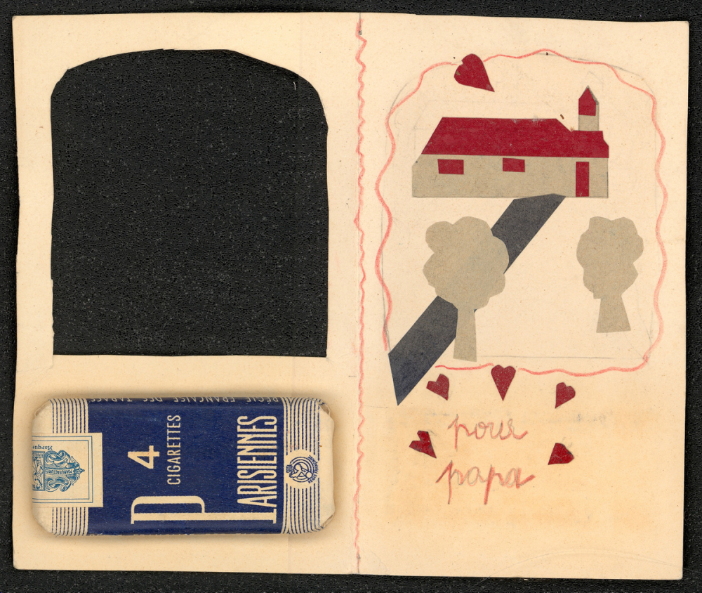 Utilisation / destination : fête (Carte réalisée dans un cadre scolaire, à l'école élémentaire communale rue des Epinettes (Paris) par un enfant âgé de 5 ans et demi, à l'occasion de la fête des pères 1956. En complément de la production manuelle, un petit cadeau est fixé à l'intérieur : un paquet de 4 cigarettes de la marque Les Parisiennes (commercialisée par la Régie Autonome des Tabacs et Allumettes, sous le contrôle du ministère des finances), produit dont la cible étant le consommateur urbain (à l'opposé des Gauloises et Gitanes) et dont l'apogée a été les années 1950. Le conditionnement en 4 cigarettes était courant à l'époque (moins cher, plus pratique à transporter).)