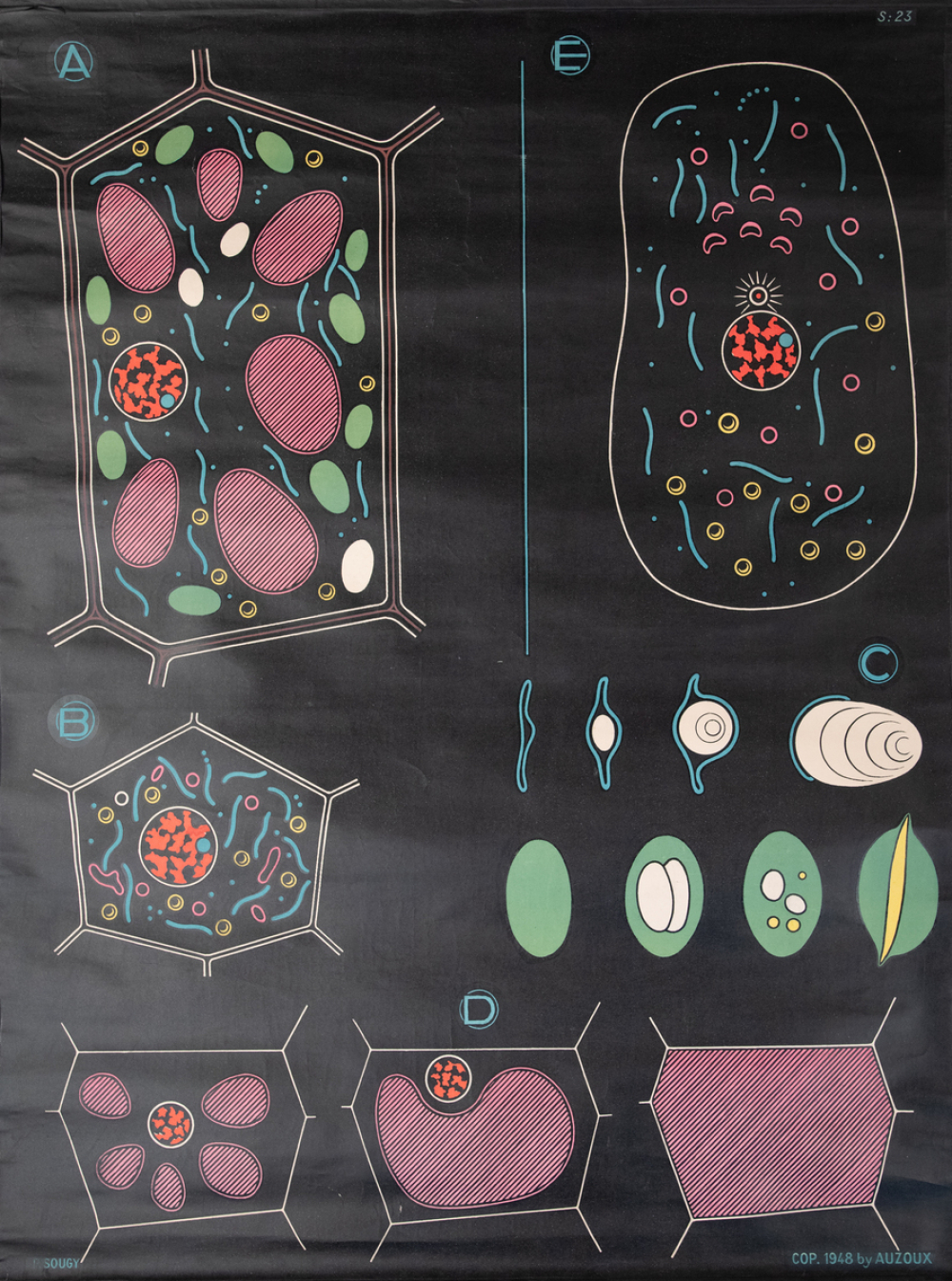 Description : Grande planche murale de sciences naturelles illustrée en couleurs sur fond noir, imprimée sur papier glacé épais avec baguettes en bois en haut et en bas de la planche munie d'un ruban de suspension et entoilée au dos.