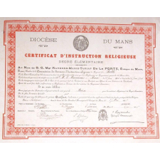 Notes : Certificat d'Instruction religieuse du degré élémentaire délivré le 27 mai 1916 à Marie-Louise Manceau à Précigné. En-tête du diocèse du Mans.