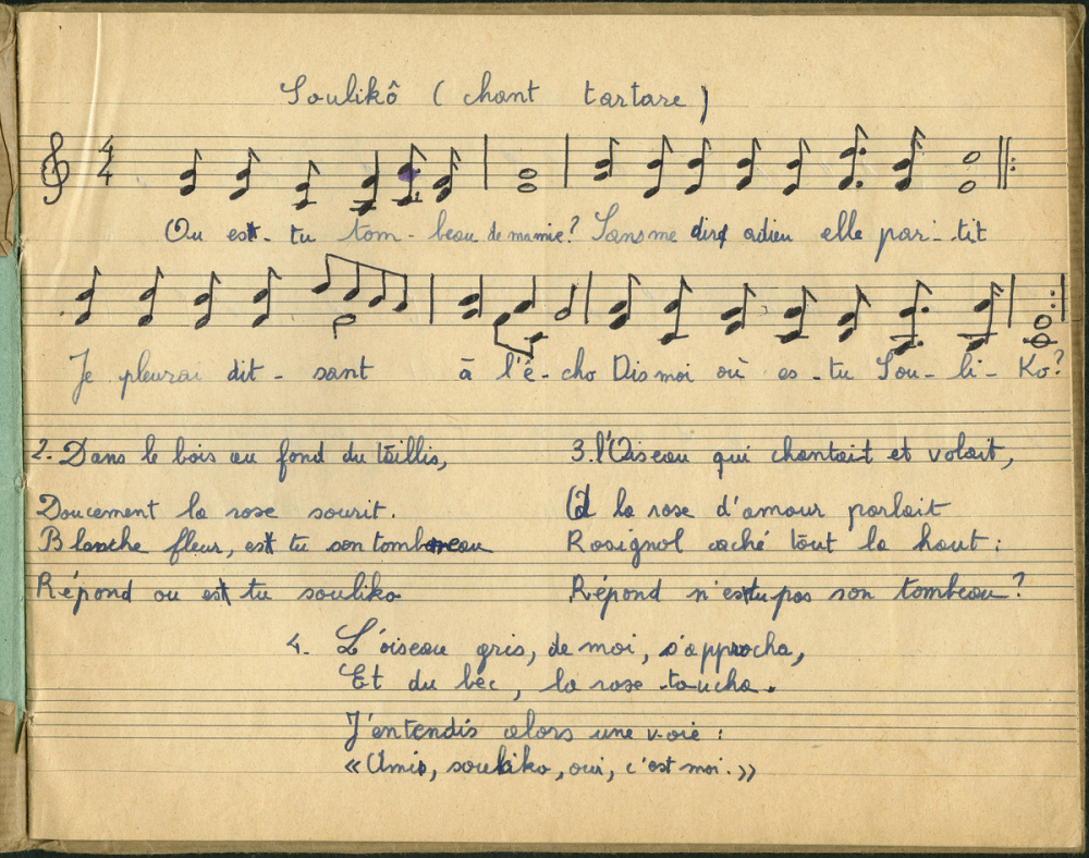 Notes : Chants divers accompagnées de leurs partitions musicales: "Soulikô (chant tartare)" / "meunier, meunier" / "mon beau sapin" / "hymne des temps futurs" de Beethoven / "la violette double-double" / "un gai luron des Flandres" de Jacques Douai