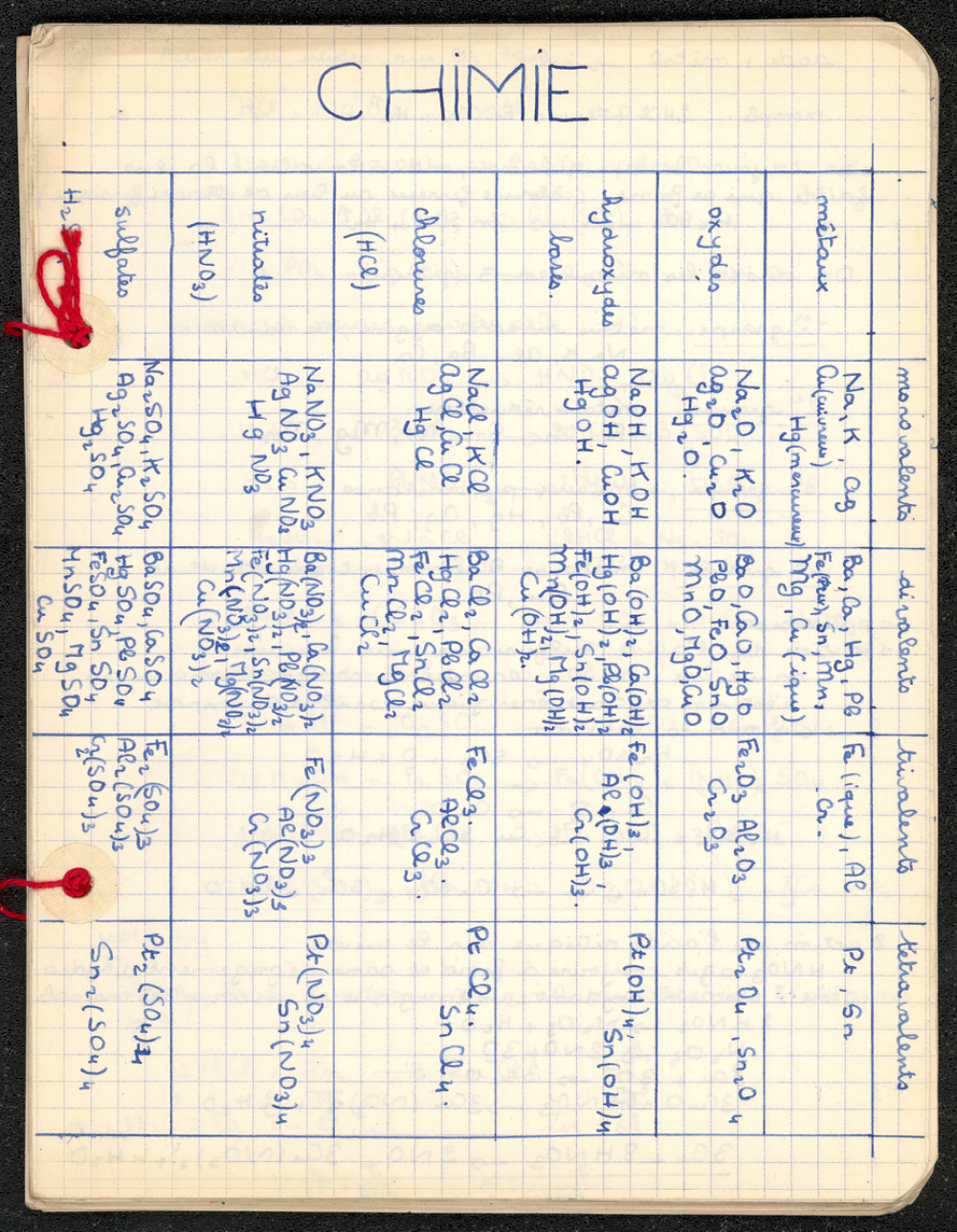 Notes : Il s'agit du cahier de Chimie de Marie-France Rocquemont (épouse Morel), élève alors scolarisée au lycée Marie Curie de Sceaux (Hauts de Seine, ex-Seine) en classe de Terminale série Mathématiques élémentaires, durant l'année 1958-1959.