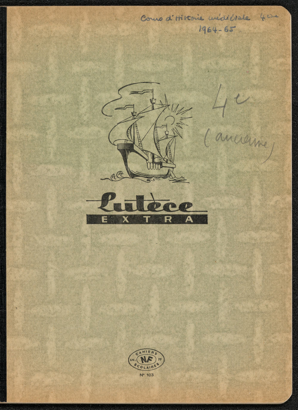 Éditeur : "Lutèce extra", Cahiers scolaires NF LIC 77 N° 103 avec l'insigne de la marque représentant une nef vue de proue à trois mâts, aux voiles gonflées par le vent, voguant sur les flots dans le soleil au zénith.