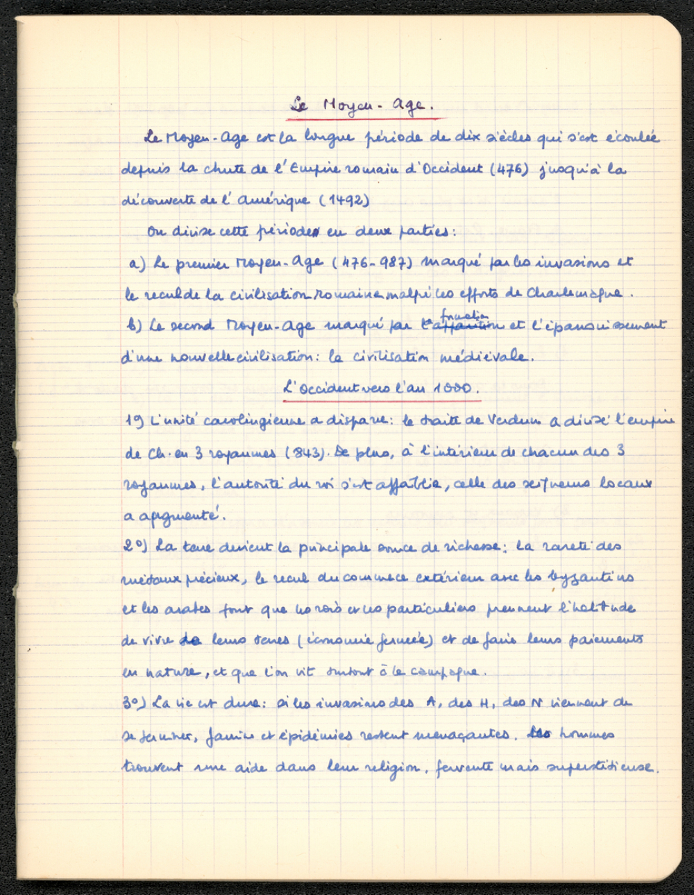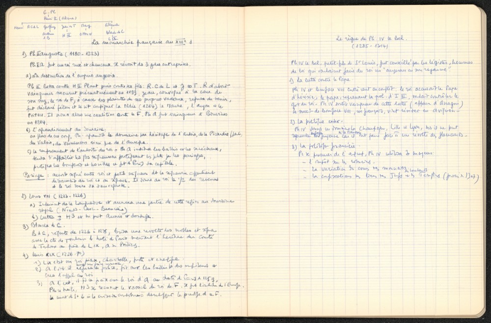 Notes : Il s'agit du cahier de préparation de cours de Dominique Thomas, enseignant d'Histoire-Géographie et d'Instruction Civique au lycée Fontenelle (futur collège) de Rouen, sur l'année 1964-1965.
