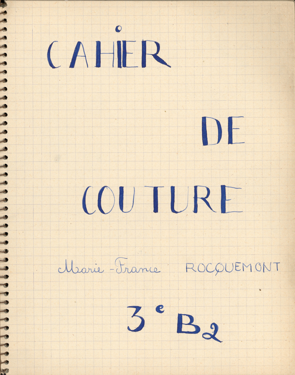 Notes : Il s'agit du cahier de travaux de couture de Marie-France Rocquemont (épouse Morel), élève alors scolarisée au lycée Marie Curie de Sceaux (Hauts de Seine, ex-Seine) en classe de 3e B2, durant l'année 1955-1956.