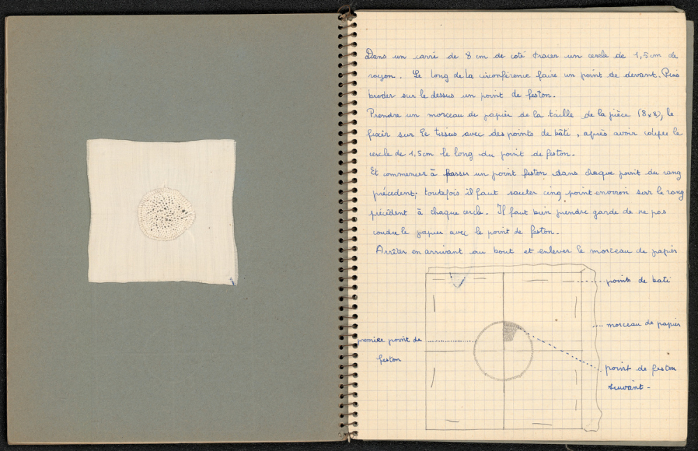 Les leçons de couture se compose d'une trace écrite évoquant la méthode à suivre sur une feuille réglée, tandis que l'ouvrage obtenu est collé sur une feuille bleu de type Canson.