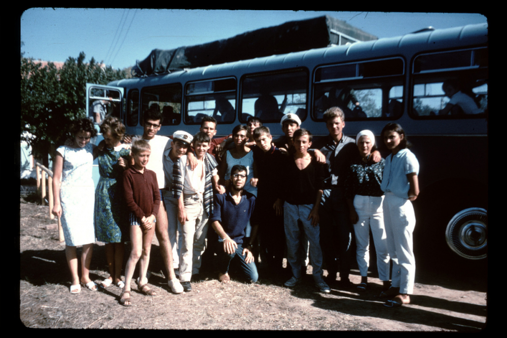 Représentations : portrait collectif : autocar / Seize personnes posent pour une photographie, dont deux hommes portant une casquette de marin.