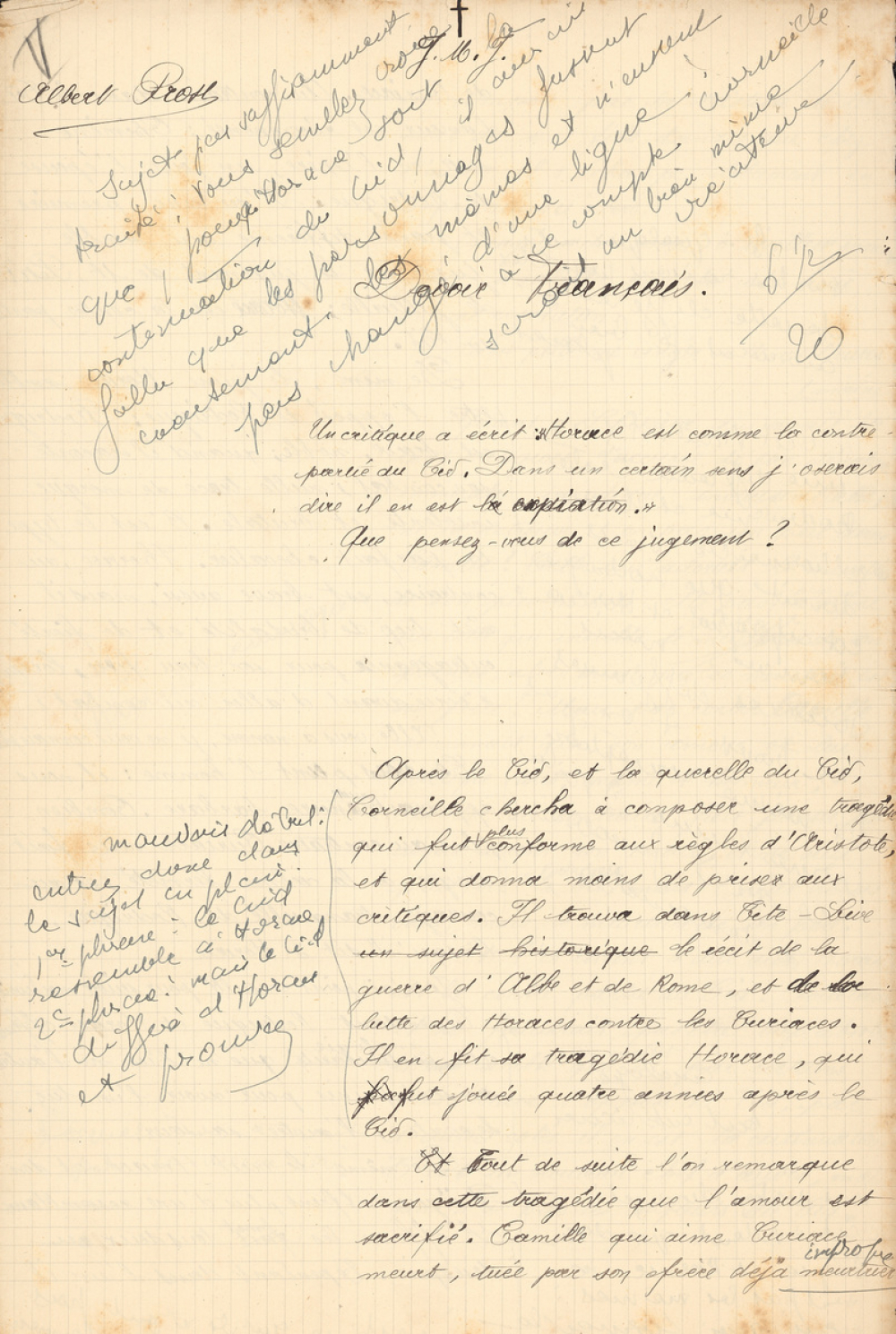 Notes : Sujet "Un critique a écrit: "Horace est comme la contrepartie du Cid. Dans un certain sens j'oserais dire il en est l'?ation"; que pensez- vous de ce jugement?", noté, appréciation du correcteur.